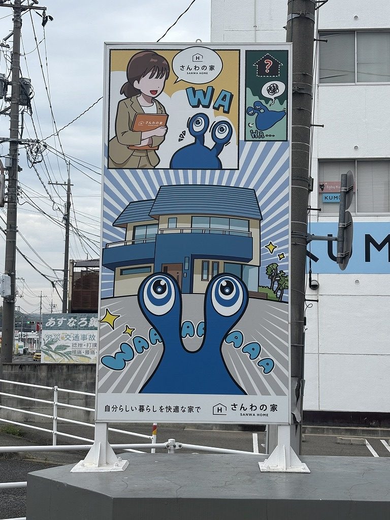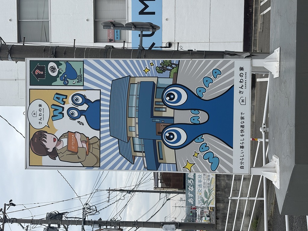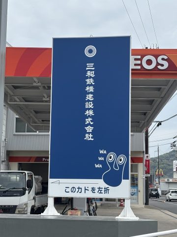 今回の看板は、これまでの雰囲気から一新し、三和鉄構建設の公式キャラクターが登場する